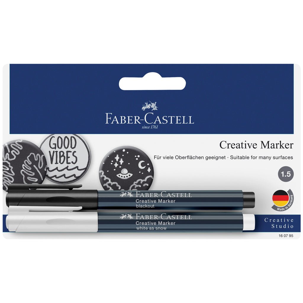 Suitable for a wide range of projects, the Faber-Castell Creative Markers are the perfect companions for sketching, doodling, crafting or embellishing personal belongings! The high-quality markers are odorless, acid-free, smudge proof, splash proof and will not bleed through most paper. The inks are waterproof after heat fixing, heat safe surfaces. Creative Markers have a 1.5mm bullet nib making them ideal for detailed designs, creating stunning contrasts, shading and bringing depth to your creations. The smooth, quick-drying water-based inks, allow for seamless application with vibrant results on a variety of surfaces, including paper, cardboard, glass, plastic, metal, stone and more! Black and White colors are easily identifiable when working between colors, by the corresponding back end of the markers and the matching detachable cap with clip. No shaking or pumping is required, allowing for a better experience and more time to create. From hobby artists and crafters to students and professionals, Faber-Castell Creative Markers are loved by creators of all skill levels. *Not dishwasher safe. Store horizontally. Ages: 13+ Contents Include: 2 Markers Blackout and White as Snow in blister card packaging
