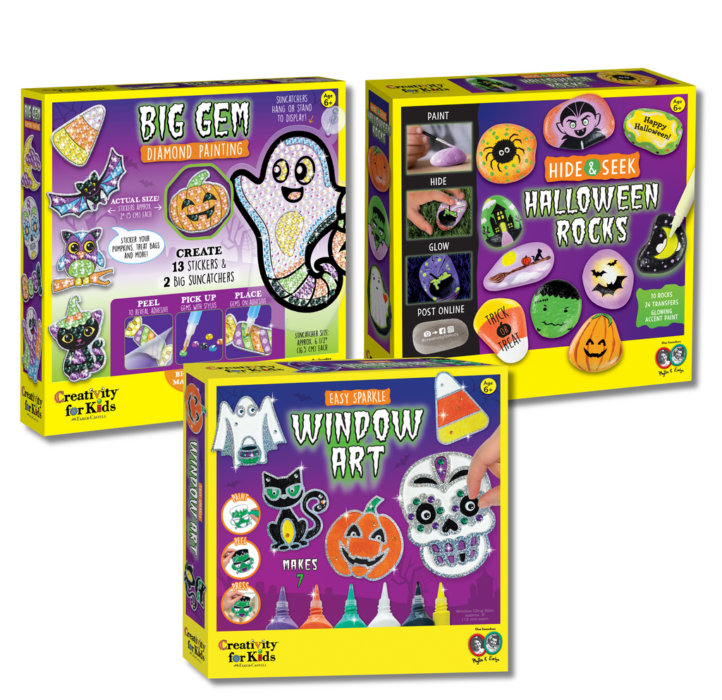 Enjoy THREE times the Halloween fun with our Halloween Craft Bundle! With Halloween Easy Sparkle Window Art, Halloween Big Gem Diamond Painting, and Halloween Hide & Seek Rock Painting kits, your little crafter can get creative all season long! This bundle is perfect for Halloween parties, family crafting sessions, and playdates.
